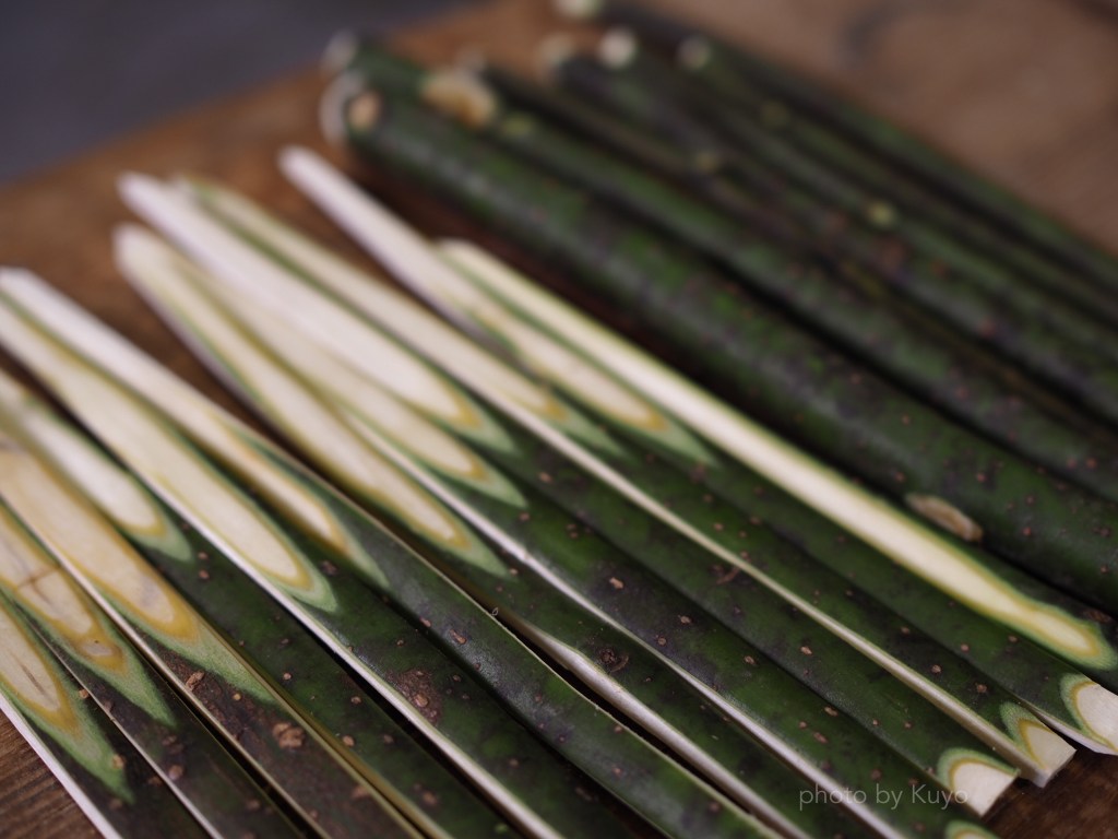 茶室で菓子をいただく際に使われる菓子楊枝の黒文字。かつては茶人自ら庭の黒文字を削り、お客様にお出ししたとか。今は忙しい時代で、黒文字の木を庭で育てる方もそう多くはなく、業者が一手に引き受けています。