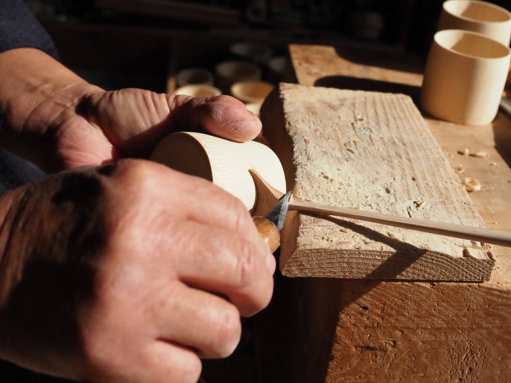 柄を削り出す際、柄の端から一息に削り上げてこの形を作るため失敗が許されず、最も気の張る箇所です。機能と使いやすさ、美しさを備えた必要十分なものができる様になるには十年以上かかります。