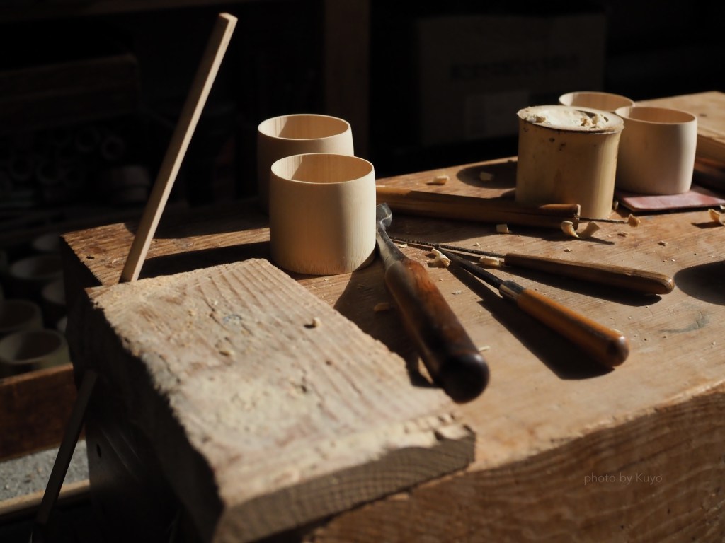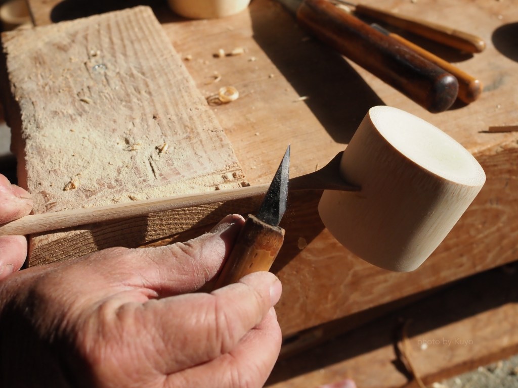寝かしておいた竹の中から、ご注文の各流儀の形にあった合の生地の大きさを選び、合の側面になる部分の竹の皮目を鉈ではつり、重さを調節します。次に鋸で底の立ち上がりを薄くなるよう落としていきます。さらに側面を削ります。合の重心がずれないよう、左右バランスよく同じ厚みになるように、小刀等で薄く削り込みます。その後、柄をつけた後、小刀等で削り込んで仕上げます。
